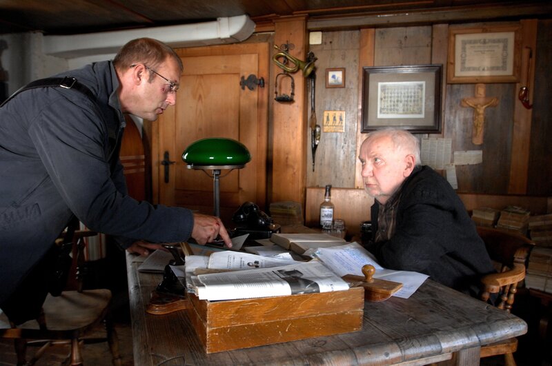 Ungeduldig versucht Matthias Auerbach (Heino Ferch, l.) beim Redakteur (Traugott Buhre, r.) des kleinen Heimatblattes etwas über die Sage des Ortes zu erfahren.
