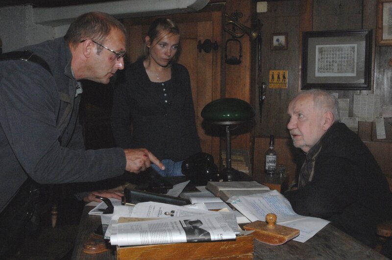 Ungeduldig versuchen Matthias Auerbach (Heino Ferch, l.) und Inka (Nadja Uhl) beim Redakteur (Traugott Buhre, r.) des kleinen Heimatblattes etwas über die Sage des Ortes zu erfahren.