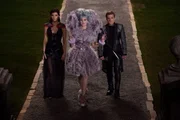 Auch Effie (Elizabeth Banks, M.) kann ihre "Zöglinge" Katniss (Jennifer Lawrence, r.) und Peeta (Josh Hutcherson, l.) nicht davon abhalten, deutliche Zeichen zu setzen. Deshalb beschließt Präsident Snow, die beiden dauerhaft und endgültig aus dem Verkehr zu ziehen ...