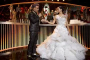 Moderator Caesar Flickerman (Stanley Tucci, l.) ahnt nicht, dass sich unter Katniss' (Jennifer Lawrence, r.) Brautkleid, das sie auf Snows Befehl hin trägt, ein schwarzes Spotttölpel-Kostüm versteckt ...
