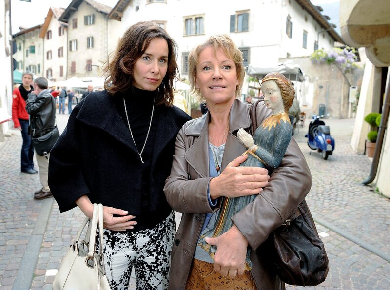 Die kunstsinnige Elisabeth (Katharina Müller-Elmau, li.) begutachtet skeptisch eine antike Statue, die Andrea (Mariele Millowitsch) auf einem italienischen Markt erworben hat.