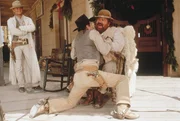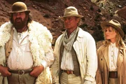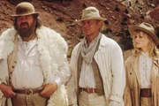 Travis (Terence Hill, M.) und sein Bruder Moses (Bud Spencer) helfen der hübschen Tierärztin Bridget (Anne Kasprik), die in der Wildnis eine Praxis eröffnen will und dabei von einigen Banditen belästigt wird.Bild: © RTL