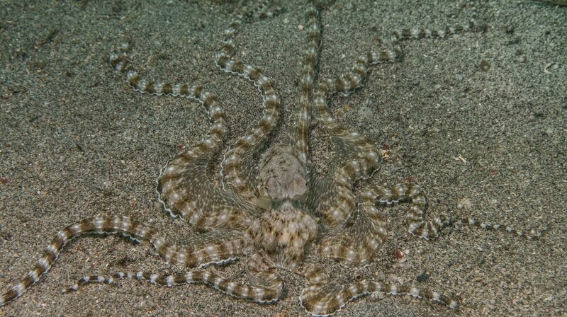 Der Mimik-Oktopus hat besondere Fähigkeiten: Er kann nicht nur seine Form und Farbe verändern, er kann sogar das verhalten anderer Tiere nachahmen.Bild: © NDR/NDR Naturfilm/doclights/Saint Thomas Productions/Marta Sostres