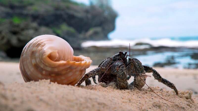 Palmendiebe verbringen die ersten Jahre außerhalb des Meeres als Einsiedlerkrebse in Schneckenhäusern.Bild: © NDR/Doclights GmbH/NDR Naturfilm & ATARA FILM GmbH