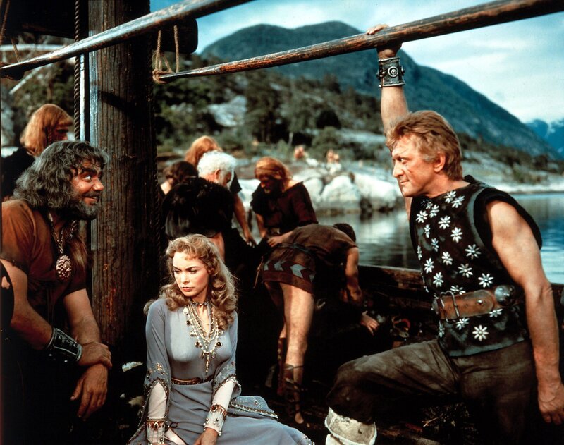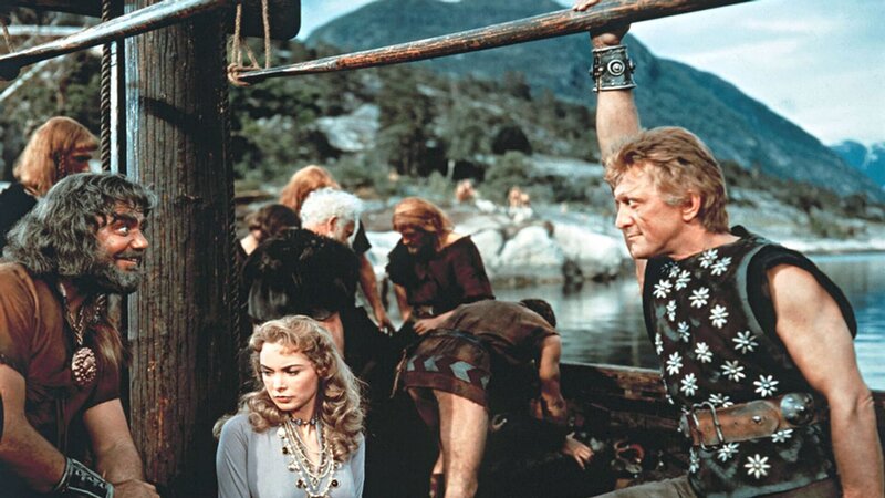 Einar (Kirk Douglas) und Ragnar (Ernest Borgnine,l.) führen einen Seeangriff aus und können Prinzessin Morgana (Janet Leigh) gefangennehmen.Bild: © arte