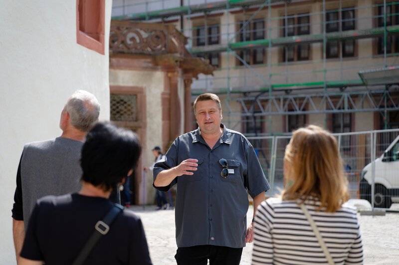 Stephen Jüngling (Mitte), Kastellan, Festung Marienberg, bei einer Führung im Innenhof der Festung.Bild: © BR/Ansgar Nöth