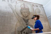 Susanne Wortmann (Restauratorin, Museum für Franken) vor dem Kiliansbanner.Bild: © BR