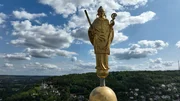 Die Statue des Heiliger Kilian steht auf der Spitze des Kiliansturms der Festung Marienberg.Bild: © BR/Tino Müller