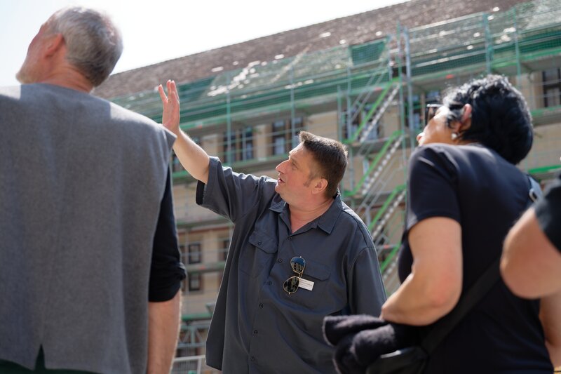 Stephen Jüngling (Mitte), Kastellan, Festung Marienberg, bei einer Führung im Innenhof der Festung.Bild: © BR