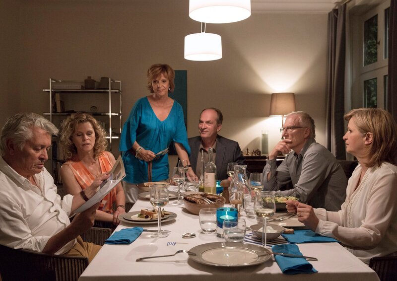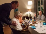 Paul (Henry Hübchen, li.), Christiane (Leslie Malton, 2. v. li.), Vera (Ulrike Kriener), Heiko (Herbert Knaup), Klaus (Ernst Stötzner, 2. v. re.) und Marlene (Johanna Gastdorf, re.) treffen sich zum Abendessen.Bild: © NDR/Degeto/Georges Pauly