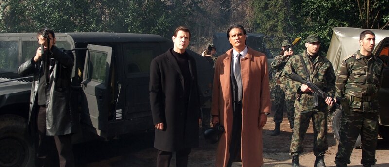 Wer belügt Mike Riggins am häufigsten? US-Strippenzieher Connelly (Michael Paré, 2.v.l.), Trent Robbins (James Chalke, 3.v.l.) oder General Drago (Bashar Rahal, r.)?; Wer belügt Mike Riggins am häufigsten? US-Strippenzieher Connelly (Michael Paré, 2.v.l.), Trent Robbins (James Chalke, 3.v.l.) oder General Drago (Bashar Rahal, r.)?