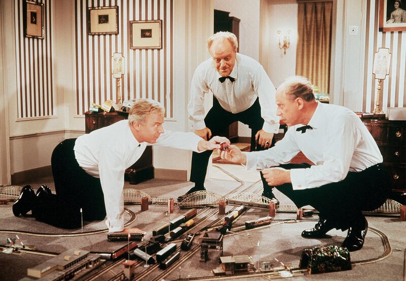 Dr. Prätorius (Heinz Rühmann, links) betätigt sich mit seinem Kollegen Dr. Klotz (Fritz Tillmann, Mitte) und Vater Höllriegel (Werner Hinz) als Eisenbahnschaffner.Bild: © ARD Degeto