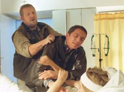 Nicht genug damit, dass Iben (Sofie Lassen-Kahlke, r) auf der Flucht vor ihrem Mann verunglückt. Noch dazu wird ihr Mann Henry (Stefan Gebelhoff, Mitte), als er die Geflohene findet, auch noch handgreiflich. Doch da ist Drechsler (Dietmar Bär) vor!Bild: © WDR/Michael Böhme