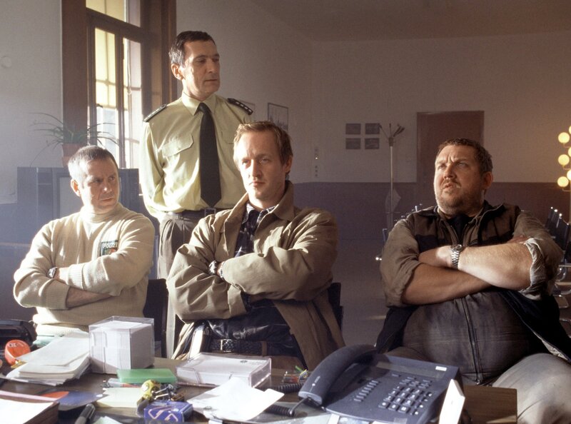 Jetzt ist aber Schluss mit lustig! Die drei Ex-Kollegen Budde (Joachim Król, l), Novak (Stephan Kampwirth, Mitte) und Drechsler (Dietmar Bär, r) haben gerade eine kleinere Meinungsverschiedenheit. Da ist der Chef, Kaminski (Rudolf Kowalski, stehend) gefordert, ein salomonisches Urteil zu sprechen. Oder den Kampfhähnen wahlweise eine Standpauke zu halten.Bild: © WDR/Michael Böhme