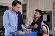 Stephan (Paul Campbell, li.) und Taylor (Tyler Hynes) müssen sich unverhofft um ein Baby kümmern.Bild: © Bettina Strauss / Hallmark Media