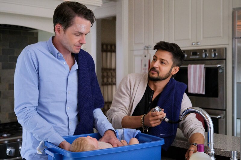 Stephan (Paul Campbell, re.) und Taylor (Tyler Hynes) müssen sich unverhofft um ein Baby kümmern.Bild: © Bettina Strauss / Hallmark Media