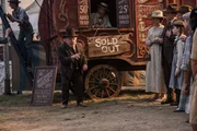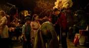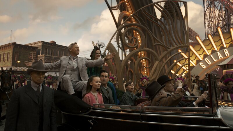 L-R: Miss Atlantis (Sharon Rooney), Rongo (DeObia Oparei), Milly Farrier (Nico Parker), Dumbo (vorne), Holt Farrier (Colin Farrell), Pramesh's Nephew (Ragevan Vasan), Pramesh Singh (Roshan Seth), Joe Farrier (Finley Hobbins), Catherine the Greater (Zenaida Alcalde), Ivan the Wonderful (Miguel Muñoz Segura).