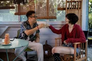 Stossen auf eine gute Nachbarschaft an: Marc Sway als Paolo Cesar und Steffi Friis als Nelly.Bild: © SRF / Miriam Künzli