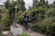 Mit dem Fahrrad unterwegs im Familiengarten, obwohl es verboten ist: Steffi Friis als Nelly.Bild: © SRF / Miriam Künzli