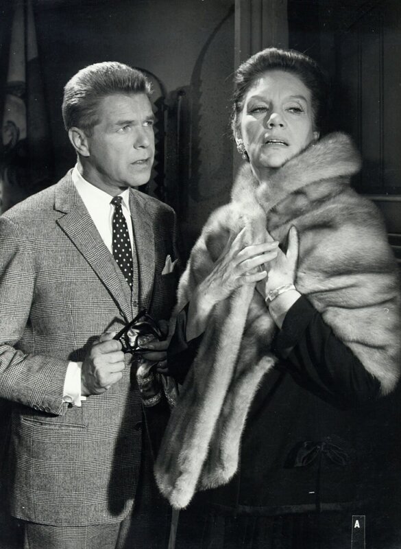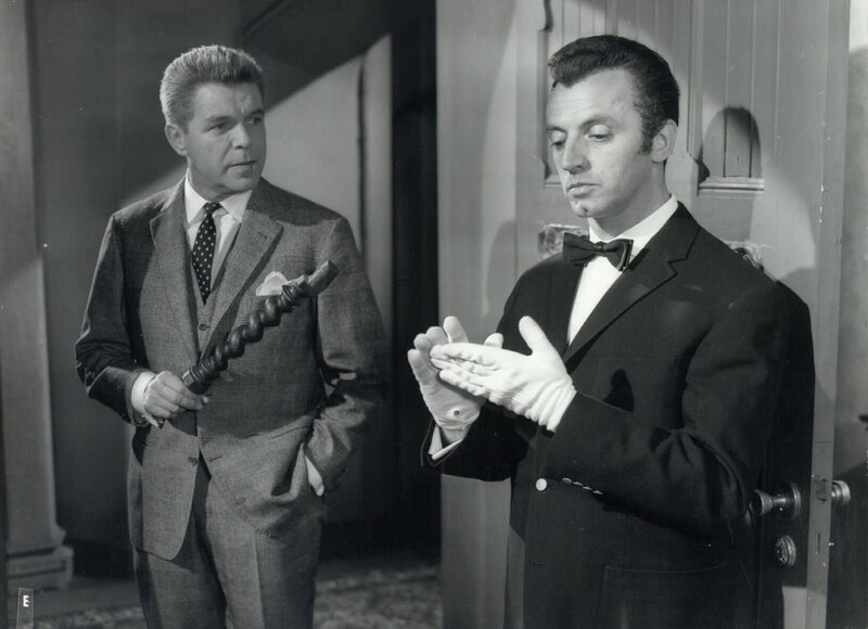 Der Anwalt Frank Tanner (Heinz Drache, links) versucht auch dem seltsamen Butler Bonwit (Eddy Arendt) Hinweise zu entlocken, die auf die Spur des Mörders führen könnten.Bild: © ZDF und Lilo Winterstein – Verleih: Tobis