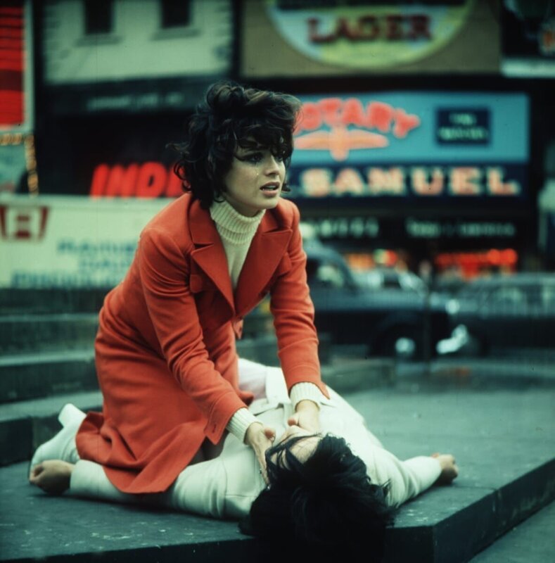 Danny Fergusson (Uschi Glas, r.) und Scotland Yard-Inspektor Craig (Hansjörg Felmy, l.) suchen im Rauschgiftmilieu nach dem grausamen Mörder von Dannys Schwester ...Bild: © Tobis Film