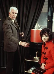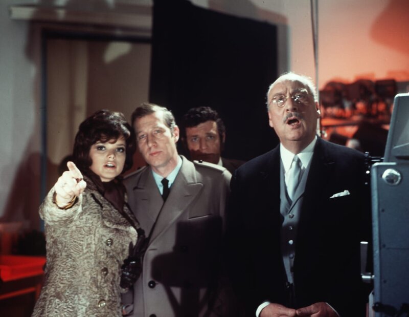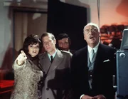 Eine unglaubliche Überraschung: Danny (Uschi Glas, l.), Craig (Hansjörg Felmy, 2.v.li.) und Sir John (Siegfried Schürenberg, r.) erkennen auf einem aktuellen Foto, dass die todgeglaubte Schwester von Danny noch lebt ...Bild: © Tobis Film