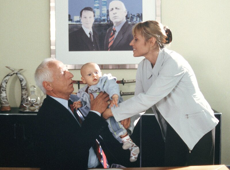 Jetzt ist es endlich heraus: Antonia (Anica Dobra) präsentiert Kriewitz Senior (Arnulf Schumacher) zum ersten Mal seinen kleinen Enkel Felix (Maximilian und Matthias Bäumler).