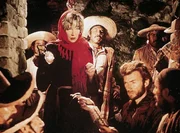 Als Hogan (Clint Eastwood, hinten r.) durch die Wüste Mexikos reitet, rettet er Schwester Sara (Shirley MacLaine, hinten l.), die von drei Männern bedrängt wird. Es entsteht eine Freundschaft zwischen den Beiden ...