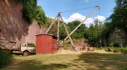 Der große Holz-Derrick-Kran im Steinbruch Michelnau ist der größte noch verbliebene Holzkran in Deutschland. Er wurde 1952 von der Firma Schmidt-Tychsen aus Hamburg entworfen und gebaut. Seine Hebelast beträgt fünf Tonnen. Der gesamte Steinbruch war seit der Stillegung Mitte der achtziger Jahre in einen Art Dornröschenschlaf gefallen und mit Büschen und Pioniergehölzen zugewachsen. Der große Holzkran ragte aus all dieser Wildnis heraus und war in einen Zustand des Verfalls geraten. Als sich der Verein "Freunde des Steinbruchs Michelnau e.V." 2010 gründete, war sofort klar, dass dieses imposante Bauwerk gerettet und als Zeugnis einer längst vergangenen Industriekultur für die Nachwelt erhalten werden muss. Damals wie heute steht der große Holzkran gleichbedeutend für die Industriegeschichte im Steinbruch Michelnau. Der Verein hat mit viel Engagement und Eigenleistung den Kran komplett saniert. Über diese Restaurierungsarbeiten ist ein liebevoller Film entstanden, der auch den in Europa einmaligen Steinbruch Michelnau vorstellt. Rot leuchtendes Basaltlava-Tuffgestein, sowie ein herrliches Biotop bilden den landschaftlichen Rahmen des frisch restaurierten Holz-Derrick-Krans."...