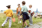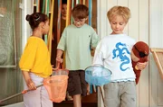Dilara, Mikkel & Mats möchten mit ihren Käschern am Wasser spielen (Helena Salame, Gregory Richters, Samuel Muller)Bild: © SWR/Wüste Medien/O-Young Kwon