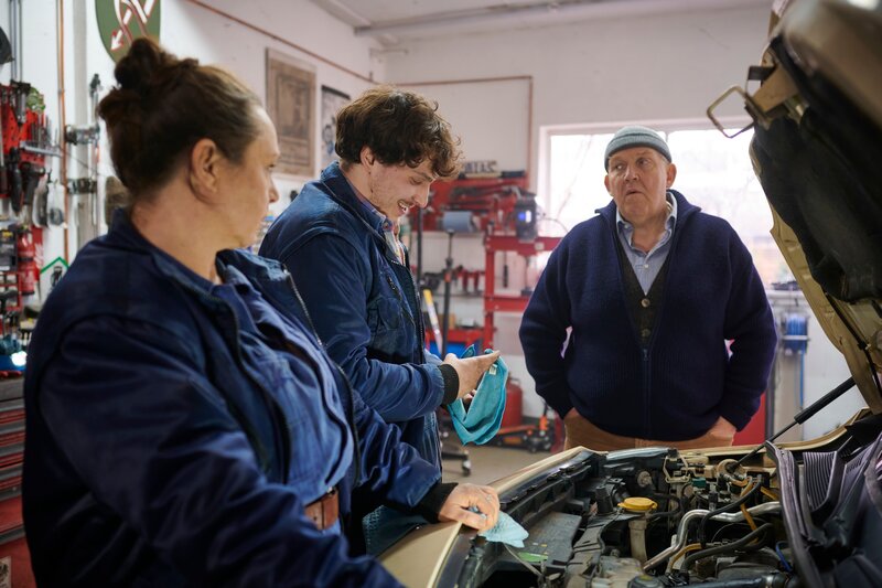 Nach der unfreiwilligen Pause nehmen Jan (Max Riemelt, l.) und Axel (Dietmar Bär, r.) ihre Fahrt Richtung Erzgebirge wieder auf, diesmal mit einem weiteren Fahrgast: Abiturientin Linh Nguyen (Nhung Hong, M.) hat sich der Fahrt nach Bergroda angeschlossen, um ihren Vater über die Feiertage zu besuchen.Bild: © ZDF und Felix Abraham