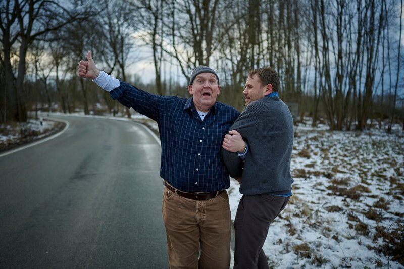 Axel (Dietmar Bär, l.) und Jan (Max Riemelt, r.) wurde der Wagen von Sofia geklaut: Anstatt nach Hamburg zurück zu fahren, heißt es jetzt in der klirrenden Kälte eine Mitfahrgelegenheit nach Bergroda zu finden.Bild: © Felix Abraham / ZDF