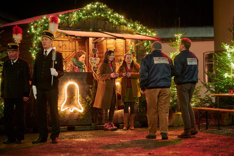 Aller Ärger vergessen: Sofia (Gabriele Völsch, 2.v.l.) und Linh (Nhung Hong, l.) sind nicht besonders erstaunt, dass Jan (Max Riemelt, r.) und Axel (Dietmar Bär, 2.v.r.) auch noch auf der Mettenschicht-Feier auftauchen, die in einem stillgelegten Stollen stattfindet und von einem Männer-Bergmanns-Chor musikalisch untermalt wird.Bild: © Felix Abraham / ZDF