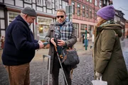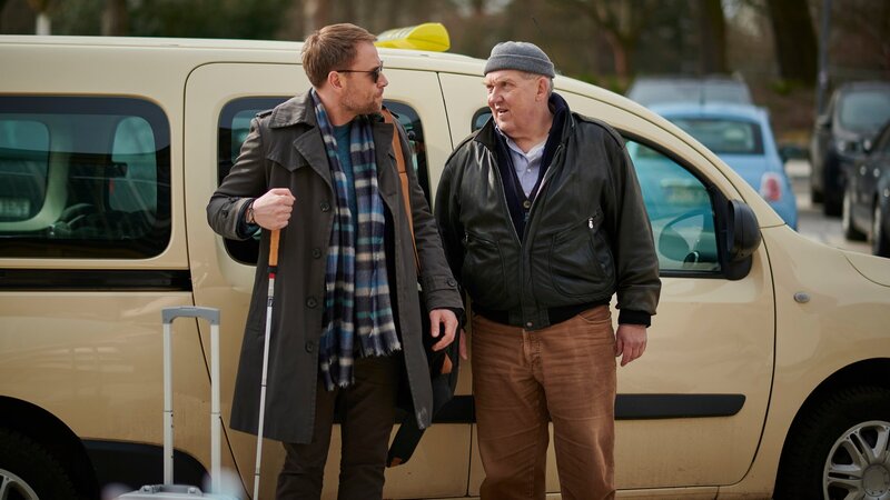 Taxifahrer Axel Parschke (Dietmar Bär, l.) kassiert von seinem Fahrgast Jan Olsmer (Max Riemelt, M.) das restliche Geld und versucht, über Jenny Fellers (Marlene Tanczik, r.) Fassungslosigkeit hinwegzusehen: Sie hat gerade erst realisiert, dass Jan blind ist.Bild: © ZDF und Felix Abraham