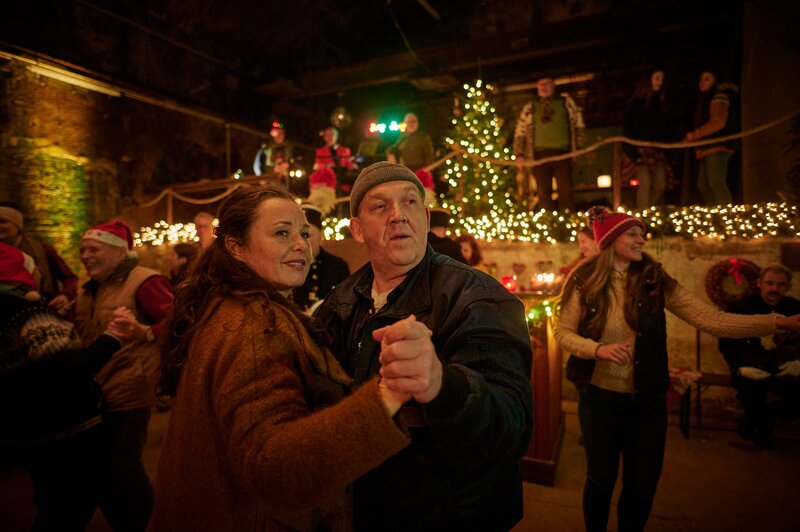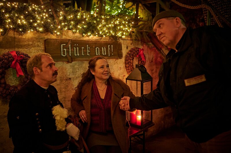 Aller Ärger vergessen: Sofia (Gabriele Völsch, l.) erklärt Linh (Nhung Hong, 2.v.l.), Jan (Max Riemelt, 2.v.r.) und Axel (Dietmar Bär, r.), was es mit dem Brauch der Mettenschicht früher auf sich hatte, deren heutige Feier in einem stillgelegten Stollen stattfindet.Bild: © ZDF und Felix Abraham