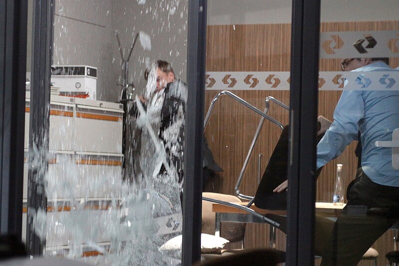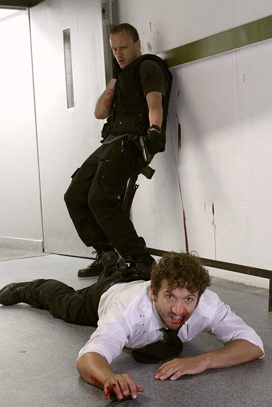 ARD/SWR EIN TODSICHERER PLAN, FilmMittwoch im Ersten, Fernsehfilm Deutschland 2014, Buch: Holger Karsten Schmidt, Regie: Roland Suso Richter, am Mittwoch (14.05.14) um 20:15 Uhr im ERSTEN. Als die Aufmerksamkeit der Geiselnehmer abgelenkt ist, versuchen Sascha Schmidt (Frederick Lau) und Filialleiter Huttenlocher (Christian Beermann), aus der Bank auszubrechen. Allerdings ohne großen Erfolg.