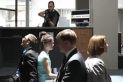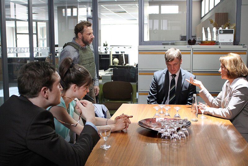Achim Buchert (Martin Butzke) hält die Geiseln in Schuss, die erst einmal damit fertig werden müssen, dass einer der Bankräuber zu ihren Kunden gehört. Was kann ihn zu einer solchen Tat getrieben haben? fragen sich Sascha Schmidt (Frederick Lau, li.), Miriam Nohe (Claudia Eisinger, 2.v.li.), Filialleiter Huttenlocher (Christian Beermann, 2.v.re.) und Gisela Rilling (Michaela Caspar).
