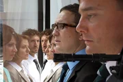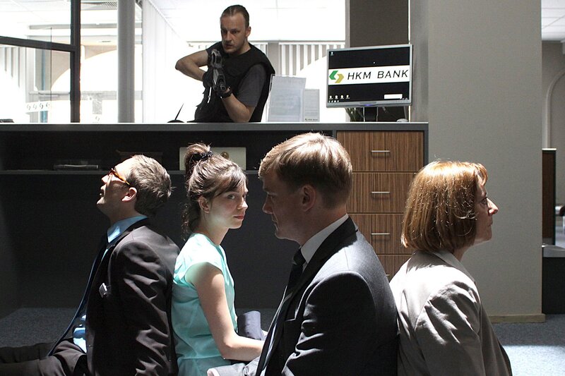 Die vier Bankangestellten Huttenlocher (Christian Beermann), Sascha Schmidt (Frederick Lau), Miriam Nohe (Claudia Eisinger) und Gisela Rilling (Michaela Caspar) sowie Martin Klein (Sebastian Gerold) müssen sich als lebende Schutzschilde im Schaufenster der Bank aufstellen, damit die Polizei nicht riskiert, das Gebäude zu stürmen (v.re.).