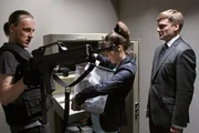Miriam Nohe (Claudia Eisinger) muss den Tresor öffnen, während Achim Buchert (Martin Butzke, re.) sie und Sascha Schmidt (Frederick Lau) mit der Waffe in Schach hält.