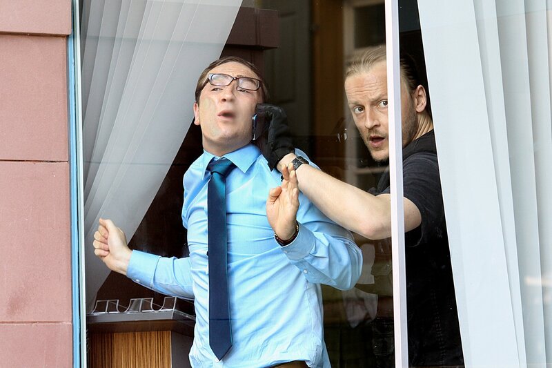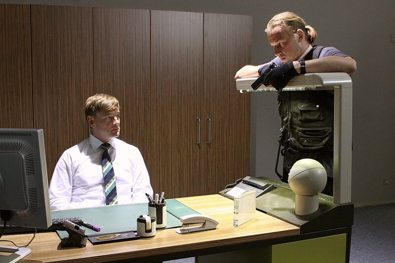 Achim Buchert (Martin Butzke) zwingt Sascha Schmidt (Frederick Lau, li.), die Geldforderungen der Geiselnehmer zu übermitteln.