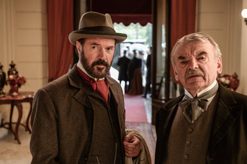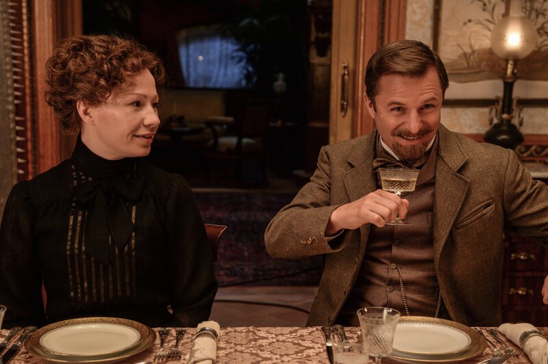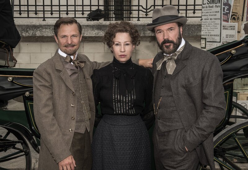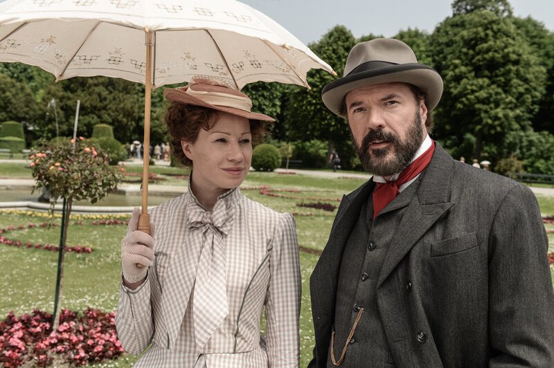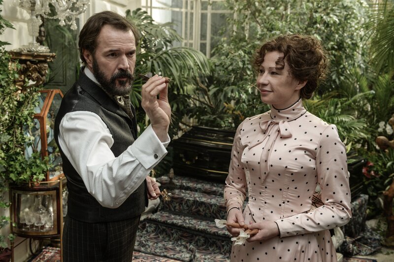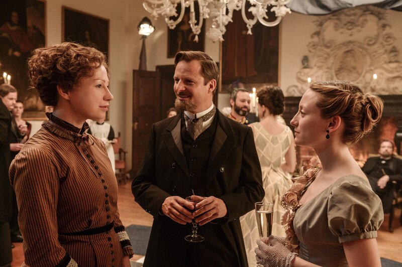 Alfred Nobel (Sebastian Koch, li.) empfängt Bertha von Suttner (Birgit Minichmayr, re.) und Ehemann Arthur (Philipp Hochmair) in seinem Haus und stellt seine „Hausdame“ Sophie (Yohanna Schwertfeger) vor.