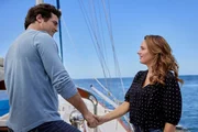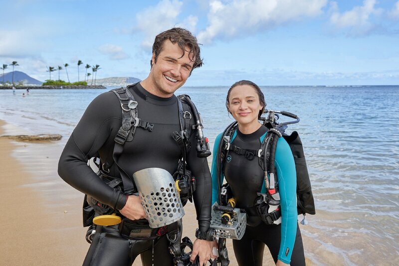 Während der Vorbereitung der Hochzeit ihrer Schwester verliert Addy (Hunter King, re.) den Ring ihrer Großmutter in den Gewässern von Hawaii. Um ihn wiederzufinden, bittet sie den Taucher Jack (Beau Mirchoff, li.) um Hilfe und verliebt sich in ihn.Bild: © Zack Dougan / ©Hallmark Media