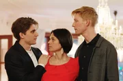 Die große Weihnachts-Überraschung für ihre Familien: Cissi (Rakel Wärmländer, M.) trägt das Kind des Paares Simon (Anastasios Soulis, l.) und Oscar (Anton Lundquist, r.) aus.Bild: © SWR