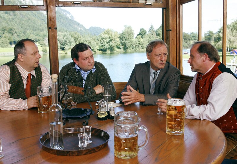 Georg Ametsrieder (Alexander Held, re.) möchte Bernhard Maiwald (Günther Maria Halmer) für seine Zwecke gewinnen, was dem örtlichen Finanzbeamten Josef Huber (Markus H. Eberhard, li.) und seinem Kollegen Mächtlinger (Maximilian Krückl, 2.v.li.) nur recht sein kann.