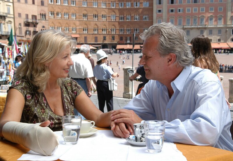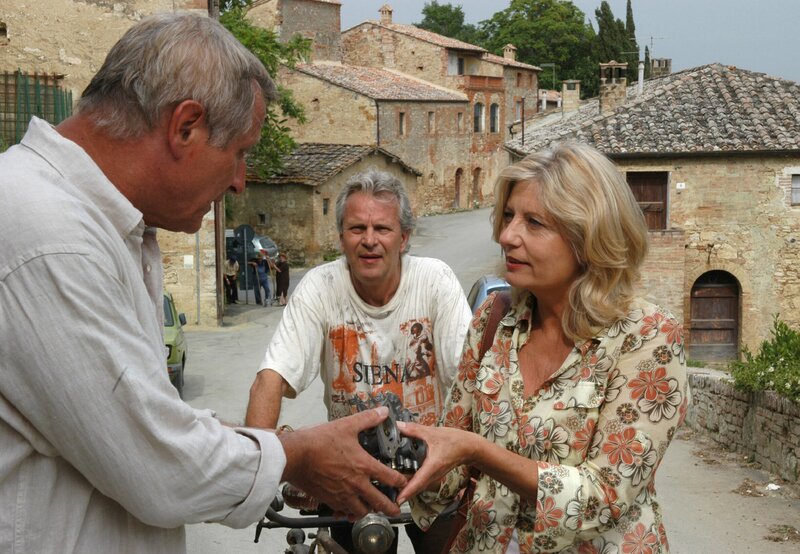 Nach vielen Jahren glücklicher Ehe haben Juliane und ihr Mann Max sich auseinandergelebt und stehen nun kurz vor der Scheidung. Eigentlich verstehen die beiden sich noch immer recht gut, doch als Max bei der Abiturfeier des gemeinsamen Sohnes mit seiner wesentlich jüngeren Freundin auftaucht, kommt es zum Eklat. Von ihrem Noch-Ehemann verärgert und enttäuscht, reist Juliane in die Toskana, wo sie den deutschen Olivenbauer Nikolaus kennenlernt. Vom ersten Moment an scheint es zwischen den beiden gewaltig zu funken. Dann aber taucht völlig überraschend Max in der Toskana auf - und plötzlich werden alte Gefühle wieder wach. Die romantische Liebeskomödie "Einmal Toskana und zurück" liefert nicht nur einen Ausflug in die malerische Landschaft Norditaliens, sondern auch tiefe Einblicke in das Seelenleben seiner Protagonisten; mit Sabine Postel, Konstantin Wecker und Peter Sattmann. Einst ein glückliches Paar mit gemeinsamen Idealen und Zielen, haben Juliane (Sabine Postel) und Max (Peter Sattmann) nach vielen Jahren Ehe erkannt, dass sie sich auseinandergelebt haben: Während Juliane in ihrem Feinkostladen biologisch hochwertige Lebensmittel aus Italien verkauft, arbeitet der Arzt Max mittlerweile als Schönheitschirurg und pflegt einen luxuriösen Lebensstil. Seit zwei Jahren leben die beiden schon getrennt, nun steht als letzter Schritt der Scheidungstermin bevor. Aber die Idee einer einvernehmlichen Trennung erweist sich auch hier als Illusion: Als Max bei der Abiturfeier des gemeinsamen Sohnes Jonas (Sebastian Fischer) mit seiner wesentlich jüngeren Freundin und Kollegin Tanja (Katja Weitzenböck) auftaucht und Jonas zu allem Überfluss auch noch ein neues Auto zum Abi schenkt, platzt Juliane der Kragen. Nach einem heftigen Streit mit ihrem Noch-Ehemann reist sie in die Toskana - jene Gegend, wo einst die Liebe zwischen ihr und Max ihren Anfang nahm. Kaum angekommen, lernt sie zufällig den deutschen Olivenbauern und Pensionswirt Nikolaus (Konstantin Wecker) kennen. Vom ersten Moment an fühlen die beiden sich zueinander hingezogen. In dem sensiblen Auswanderer scheint Juliane endlich die Chance auf eine neue Liebe zu finden. Dann aber taucht völlig überraschend Max in der Toskana auf, der seiner Noch-Ehefrau in einem Anflug von Nostalgie und Wehmut gefolgt ist. Gemeinsam schwelgen die beiden in Erinnerungen an unbeschwertere Zeiten - und schon bald werden alte Gefühle wieder wach. Die Situation wird nicht einfacher, als auch Tanja in die Toskana reist, um Max nach München zurückzuholen. War es für Max doch nur ein kurzes Aufflackern längst verloschener Gefühle? Und hat Juliane in dem naturverbundenen Nikolaus nicht einen Mann gefunden, der viel besser zu ihr passt als der Karrierist Max? Als der Tag des Scheidungstermins schließlich da ist, kommt es jedenfalls zu einer Wendung, mit der kaum jemand gerechnet hat. Mit "Einmal Toskana und zurück" hat Imogen Kimmel eine bezaubernde Romantikkomödie inszeniert. Vor der malerischen Kulisse Norditaliens erzählt der Film eine Geschichte von alten Beziehungen und neu erwachter Liebe. Die Hauptrollen spielen Sabine Postel, Peter Sattmann und der Liedermacher Konstantin Wecker. In weiteren Rollen sind Katja Weitzenböck als verständnisvolle Geliebte, Sebastian Fischer als verliebter Sohn und Hans Peter Hallwachs als deutscher Auswanderer in Italien zu sehen.