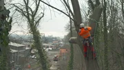 Die Experten müssen am Hauptbahnhof in Kassel ran: Hier führen Gleise entlang eines bewaldeten Steilhangs. Die Oberleitungen befinden sich in direkter Baumnähe.Bild: © WeltN24 GmbH