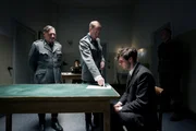 Das Hitler-Attentat ist knapp gescheitert. Georg Elser (Christian Friedel, re.) wird von Arthur Nebe (Burghart Klaußner, Mitte) und Heinrich Müller (Johann von Bülow, li.), verschärft verhört. Sie glauben ihm die Alleintäterschaft nicht.Bild: © ORF
