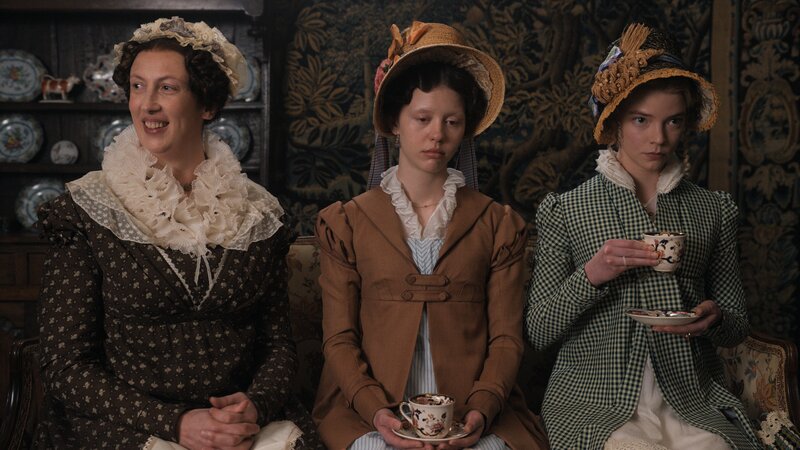 Miranda Hart (Miss Bates), Mia Goth (Harriet Smith), Anya Taylor-Joy (Emma Woodhouse).Bild: © ORF/Universal/Focus Features