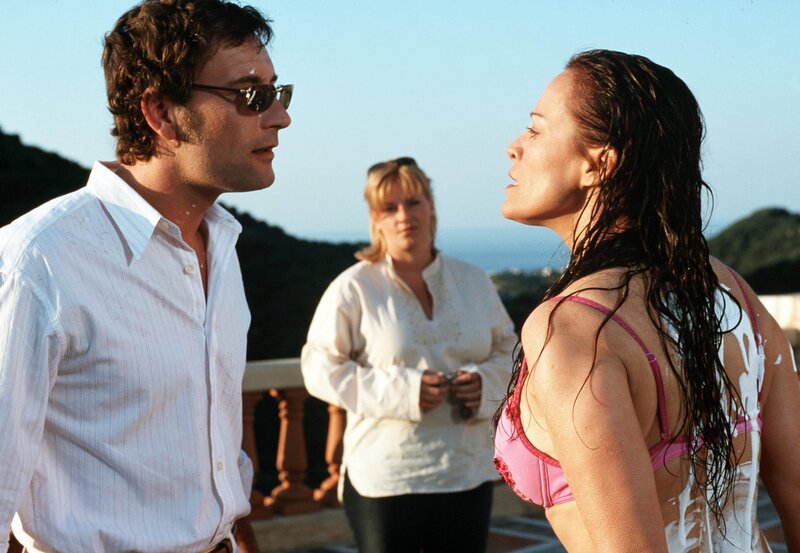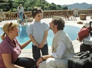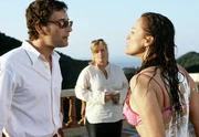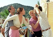 Unter der griechischen Sonne kommt es zu Spannungen zwischen Tobias (Heikko Deutschmann) und Marion (Sonja Kirchberger, re.), die aufgrund einer Doppelbelegung im selben Ferienhaus untergekommen sind. Nora (Petra Kleinert, Mitte) ist ratlos.