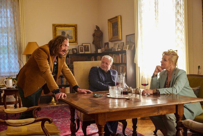 Pierre (Denis Schmidt, links) bietet Beatrice (Petra Morzé) und Henk (Filip Peeters) seine Dienste als Privatdetektiv an.Bild: © Fabio Eppensteiner / BR, ORF, Cult Film GmbH